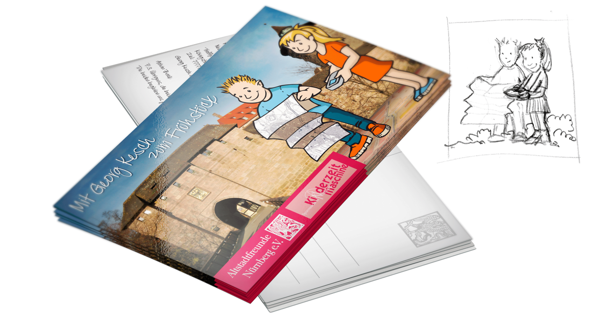 Laura und Baldi reisen auf einer Postkartenserie in Nürnbergs Vergangenheit