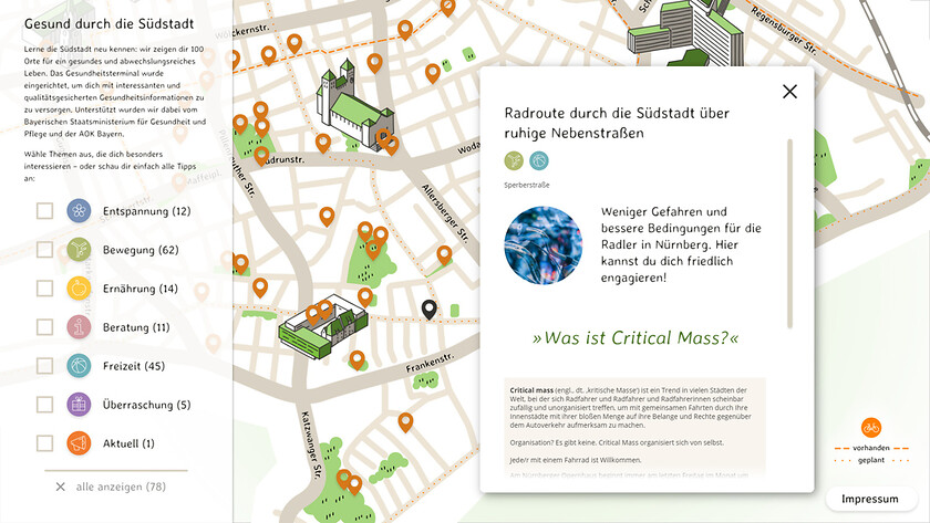 Ein interaktiver Stadtplan in handgezeichneter Optik weist den Weg zu gesunden Angeboten in Nürnbergs Südstadt