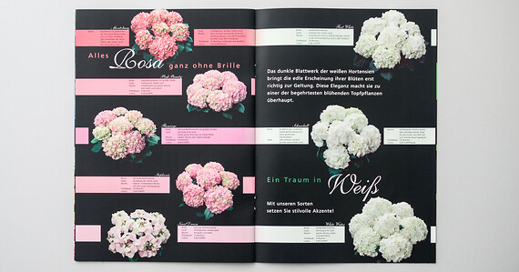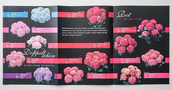 UV-Lackierung und Mattfoliencellophanierung für den Gesamtkatalog des Hortensien-Züchters