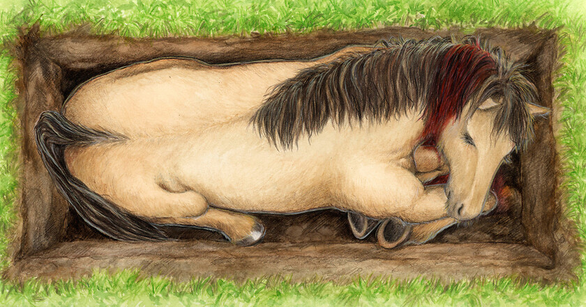Dazu wurden von mir vier Situationen illustriert: die Tötungsszene, das tote Pferd, der Fundort am Hügelgrab und der archäologische Knochenfund.