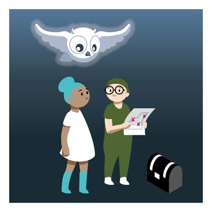 Begleitet werden Sophie und Jonathan von einer Stimme, die viel über die Bibel weiß und Tipps gibt – und hier die Gestalt eines freundlichen, eulenähnlichen Wesens erhalten hat, das auch bildlich Licht ins Dunkel bringt.