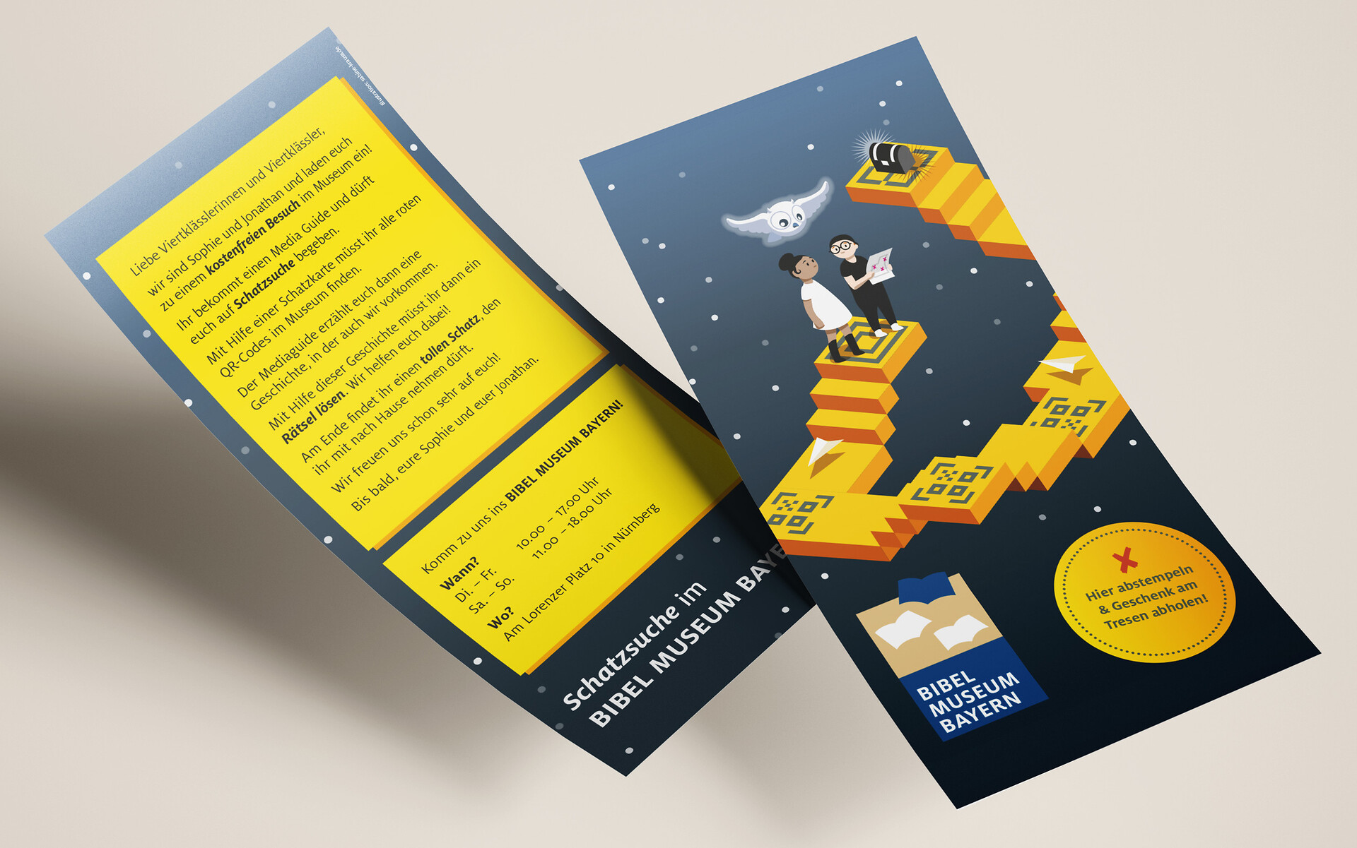 Eine interaktive Schatzsuche mit Sophie und Jonathan regt mit kleinen Aufgaben zur Auseinandersetzung mit ausgewählten Exponaten an. Mit Postkarten werden Kinder der 4. Klassen aller bayerischen Schulen ins Museum gelockt.