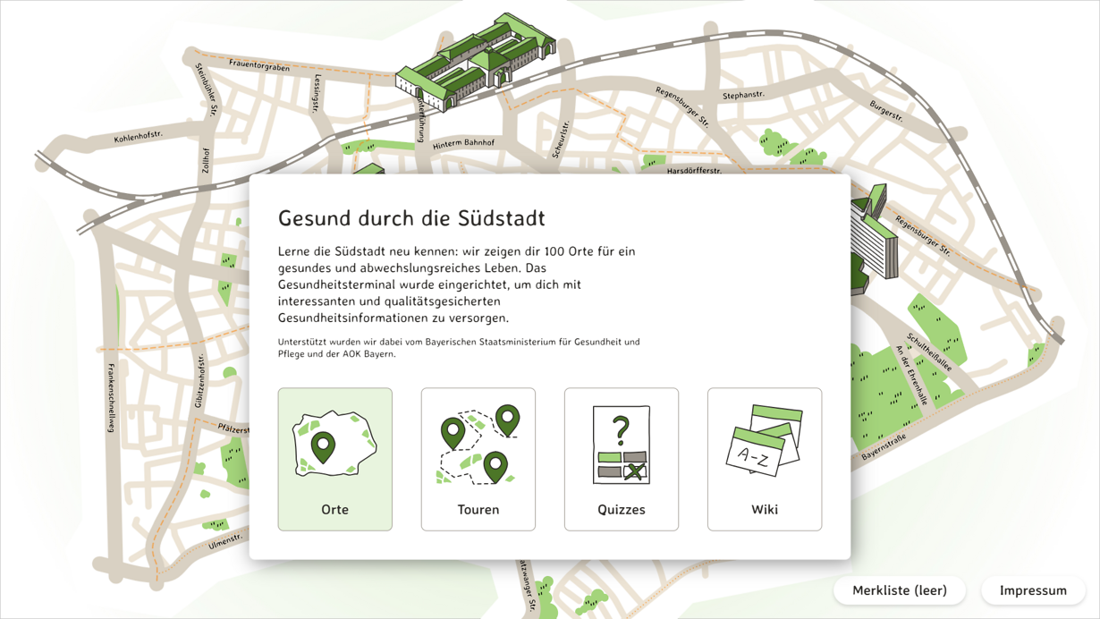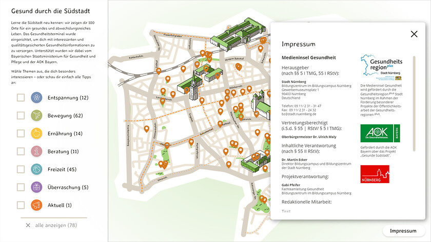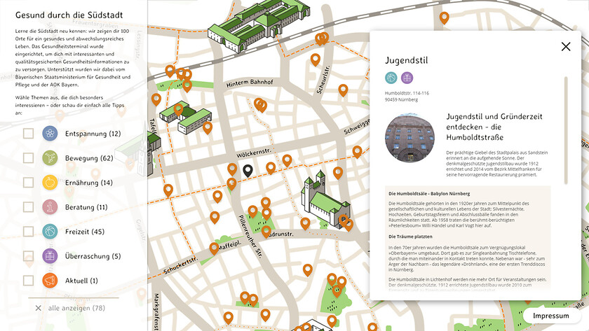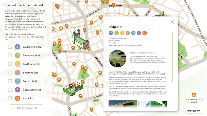 Ein interaktiver Stadtplan in handgezeichneter Optik weist den Weg zu gesunden Angeboten in Nürnbergs Südstadt
