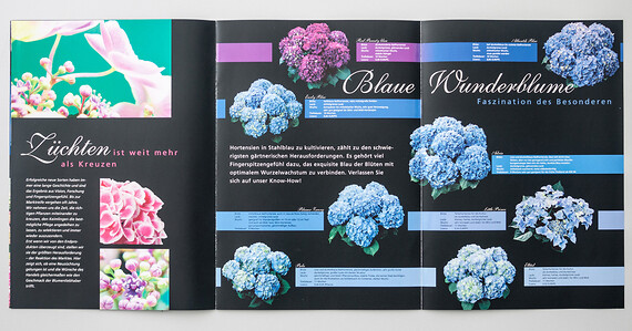 UV-Lackierung und Mattfoliencellophanierung für den Gesamtkatalog des Hortensien-Züchters