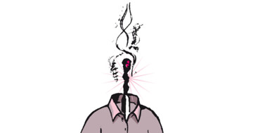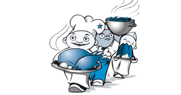 Typischer Ablauf: Auf Durchsicht der Artikel und Auswahl von Kernaussagen folgen Vorskizzen von Hand und Abstimmung mit dem Kunden und schließlich Ausarbeitung und Kolorierung – jeweils in der Farbe der aktuellen Ausgabe.