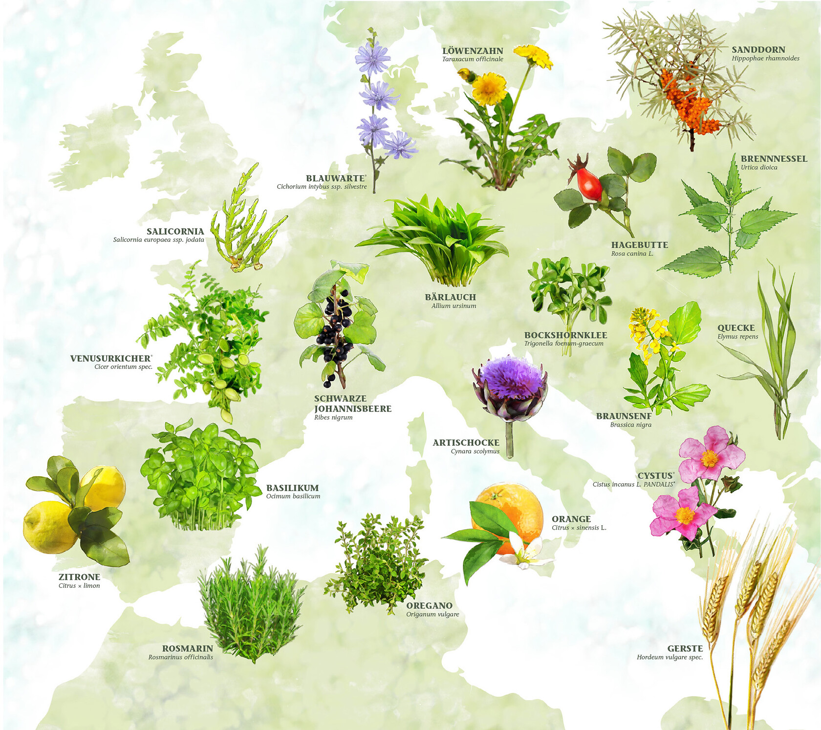 Als Wandbild im Eingangsbereich des neuen Firmensitzes zeigt die Grafik die verarbeiteten »urheimischen« Pflanzen und ihre Herkunftsgebiete aus ganz Europa.